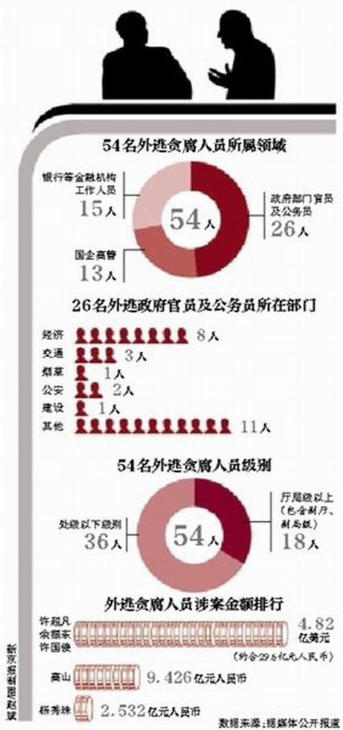 在记者整理的50起案件涉及的54名外逃贪腐人员中,在政府部门任职者有26人,除了2名从事金融业务的普通公务员外,其余均为各级别的官员。