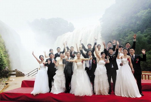 新人们在黄果树大瀑布下拍摄集体照 摄/卢 维