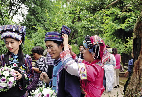 新人身着民族服装拍摄外景,细心的新娘为新郎整理头饰 摄/王 凯