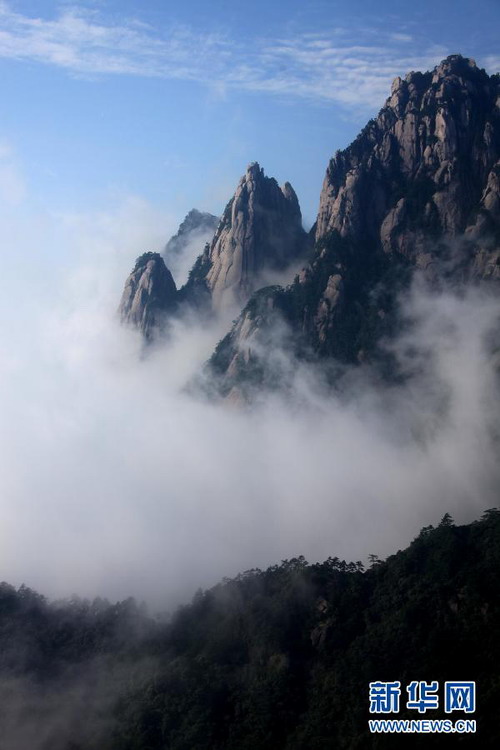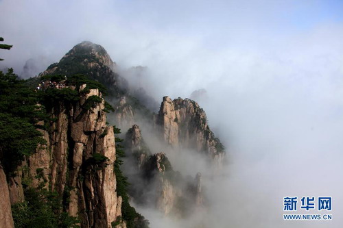 2014年8月9日在黄山风景区拍摄的云海美景。当日,安徽黄山风景区雨后放晴,出现了壮观迷人的云海。 新华社发(施广德 摄)