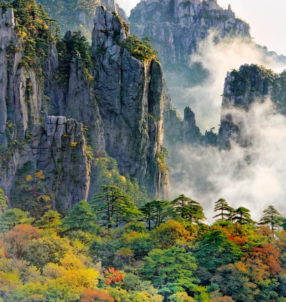 黄山雄踞于安徽南部的黄山市境内,群峰竞秀,怪石林立,有千米以上高峰88座,“莲花”、“光明顶”、“天都”三大主峰,海拔均逾1800米。黄山被世人誉为“人间仙境”、“天下第一奇山”,以奇松、怪石、云海、温泉、冬雪“五绝”著称于世,山中的温泉、云谷、松谷、北海、玉屏、钓桥六大景区,更是风光旖旎,美不胜收。