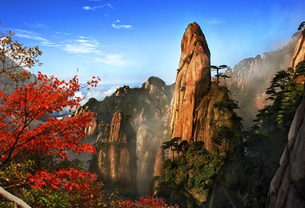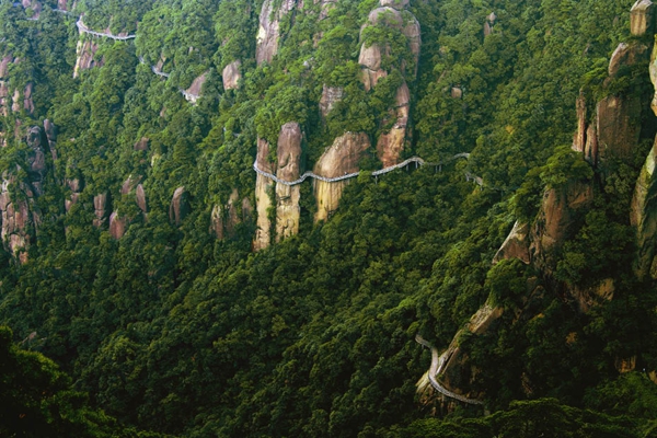 三清山位于江西省上饶市东北部,“奇峰怪石、古树名花、流泉飞瀑、云海雾涛”被称为三清山四绝。其景观的形成与其地质、气候条件息息相关,是地壳运动长期变迁的产物。三清山经历了14亿年的地质运动,形成了举世无双的花岗岩峰林地貌,有“世界地质公园”之称,中美地质学家一致认定三清山是“西太平洋边缘最美丽的花岗岩”。