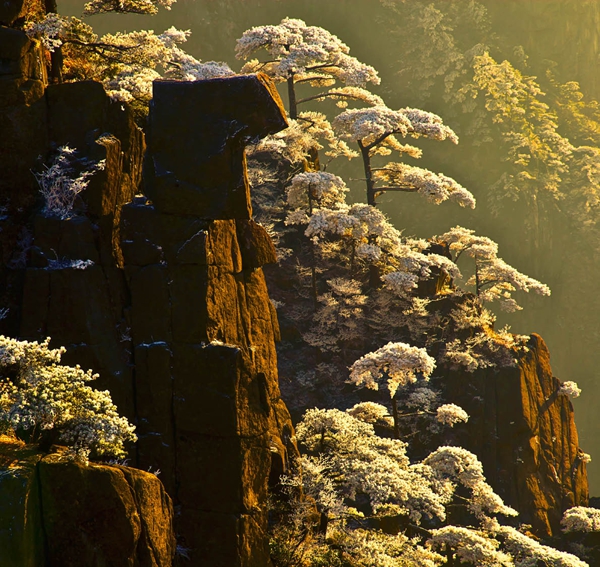黄山云成海,是云雾之乡,其瑰丽壮观的“云海”以美、胜、奇、幻享誉古今,一年四季皆可观,尤以冬季景最佳。依云海分布方位,全山有东海、南海、西海、北海和天海。黄山一年之中有云雾的天气达200多天,水气升腾或雨后雾气未消,就会形成云海。红树铺云,成片的红叶浮在云海之上,是黄山深秋罕见的奇景。北海双剪峰,当云海经过两侧的山峰约束,从两峰之间流出,向下倾泻,是黄山的又一奇景。