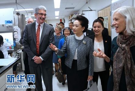 9月23日,国家主席习近平夫人彭丽媛在西雅图参观专门从事癌症及致命传染病研究的福瑞德·哈金森研究中心。 新华社记者 马占成 摄