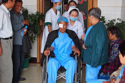 “感谢政府、感谢共产党、感谢九三学社!”来自金塔县的64岁的五保户李大年双手合十从病床上坐起来,旁边的护士赶忙把他搀扶住。那边门口又聚拢来许多蒙着纱布的病人和他们的家属,要进来。小小的病房瞬时挤得满满,笑声、掌声、相机的咔嚓声夹杂着,好不热闹。这是九三学社社会服务部副部长王金茹和酒泉市宣传部长杨小丽探望病房时候的一幕。