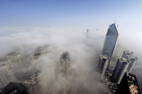 年初中国华北、黄淮、江淮、江南等中东部大部分地区相继出现大范围雾霾天气,中央气象台发布最高级别雾霾黄色预警。图为大雾罩城的江西南昌市
