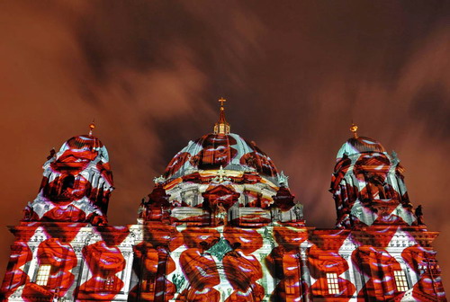 当地时间2013年10月15日,德国柏林灯光节持续举行,图为红唇被投射到大教堂外墙上