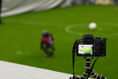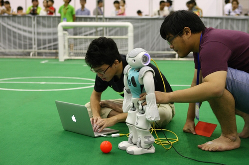 德国队在调试参加足球比赛的小型机器人。