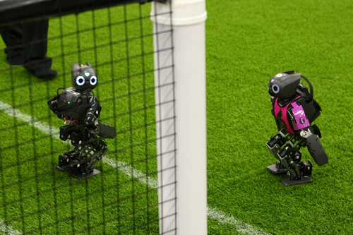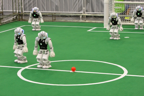 标准平台组的机器人在比赛中经常出现人仰马翻的情景,激烈程度不亚于人类的比赛。
