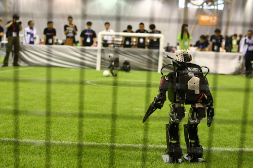 韩国队的类人组机器人在比赛。