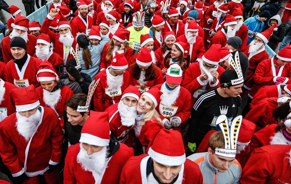 当地时间2015年12月20日,俄罗斯莫斯科,民众装扮成严寒老人(相当于圣诞老人)参加慈善跑