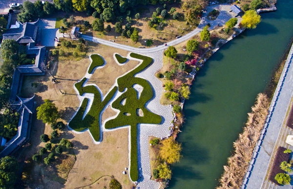 2015年12月6日,江苏镇江市金山公园镜天园景区巨大“禅”字景观。进入冬季,万木枯荣,而用11000株生命力强的欧洲荚迷植物勾勒出的“禅”字仍叶色饱满,该字占地面积达1350平方米