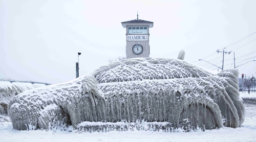 当地时间2016年1月12日,据ABC报道,1月11日美国纽约州西部城市布法罗(Buffalo)由于大量降水和较低温度,一辆车上披上了一件厚厚的“冰衣”