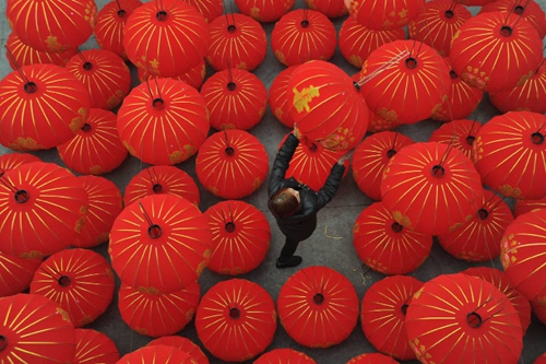 2016年1月5日,山西运城市,一名工人在稷山县杨赵村灯笼产业园区的灯笼作坊悬挂晾晒节日订单灯笼