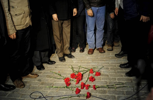 当地时间2016年1月12日,土耳其伊斯坦布尔,人们在苏丹艾哈迈德广场献花悼念遇难者。