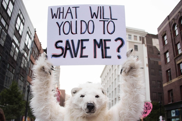 当地时间2016年7月18日,美国克利夫兰。美国共和党全国代表大会举行,一名反全球变暖的抗议者在会场外示威