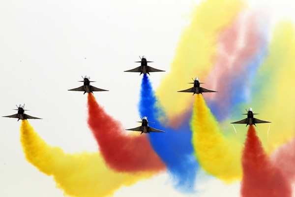 2016年11月1日,广东珠海,中国空军八一飞行表演队驾驶歼10进行飞行表演