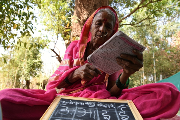 “奶奶学校”学员、68岁的Sulochona Kedar在课上阅读教材