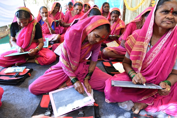 印度马哈拉施特拉邦塔那Fangane村,“奶奶学校”学员在学习写字