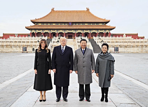 2017年11月8日,中国国家主席习近平和夫人彭丽媛陪同来华进行国事访问的美国总统特朗普和夫人梅拉尼娅参观故宫博物院。这是两国元首夫妇在太和殿广场合影