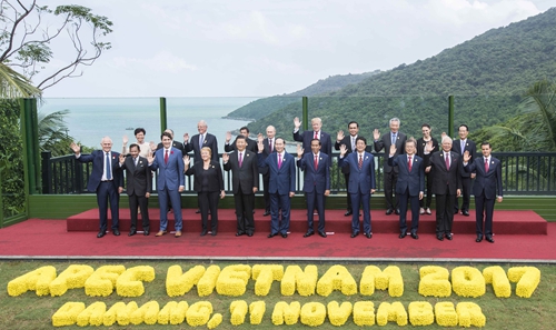 当地时间2017年11月11日,亚太经合组织第二十五次领导人非正式会议在越南岘港举行。中国国家主席习近平出席并发表题为《携手谱写亚太合作共赢新篇章》的重要讲话。这是会议期间,中国国家主席习近平同其他亚太经合组织成员经济体领导人、代表合影