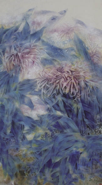 春光明媚是石兰的性格也是她作品的主题。为求表现得恰如其分,她接受导师的建议,深入云南西双版纳体验生活,那里的热带花卉长得鲜艳欲滴、蓬蓬勃勃;而且那里四季如春,正是她要表现的意境。她发挥热带花卉色彩鲜艳的优势,突出色块之间的对比,尽量淡化细节。她的作品特别适合放在较大的厅堂,近看洋洋洒洒,远看效果强烈震撼。