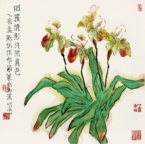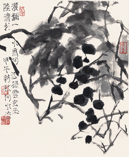 何水法的笔墨中国画坛有目共睹,但他从不抱守笔墨。他强调笔墨是情怀、是境界。对齐白石的“似与不似”,他亦有新的理解。“似与不似”过去我们从形而下理解的较多,要真正读懂白石老人之苦心一定要从形而上着眼。因为“似与不似”既关形式又关精神。宋代苏东坡论画主神似。神似,从气格上讲就是精神。审美物象因为有了精神才神采飞扬。所以何水法笔下的花鸟不在乎“似与不似”,他关注的是生命磁场、是精神气象、是美的创想。他的每一幅作品写的是生命本质和精神现象。如《一串红》、《倾阳》等,笔墨已完全诗意化、情思化、生命化了。无疑这些作品是画家对花的释读和想象,是人与花之精神的超然形态,是艺术家对花鸟的澄怀味象。艺术家力求在作品中体现一种观念、实现一种精神和化酿一种情怀。这些笔墨既是21世纪艺术生命的活体,又是中国艺术精神之本体。