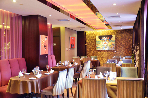走近餐厅,早就有热情的服务生在门外迎接领位,进入门廊,落座后的热柠檬水很快就缓解了外边三九天的寒意。餐厅有60多个餐位,摇曳的水晶烛台,琳琅满目的纯正法国红酒,紫色的天鹅绒沙发,四壁悬挂着的艺术家许德奇先生的油画,营造出时尚、浪漫、舒适的氛围。