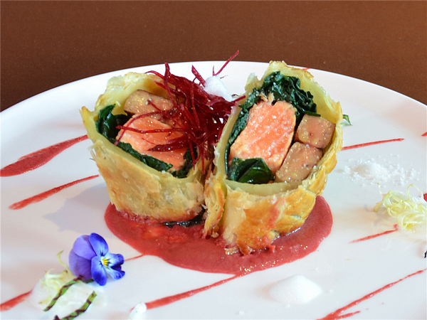 惠灵顿三文鱼法肝,辣味红菜头汁
