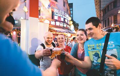 6月8日,来自乌克兰的游客在浙江宁波老外滩品尝美酒。 新华社记者 翁忻旸摄