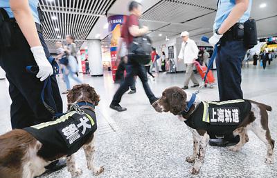 6月15日,民警携捜爆犬在上海地铁徐家汇站值勤。 新华社记者 凡 军摄