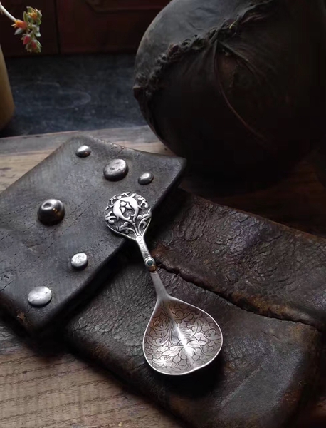 随着收藏的深入,黄懿开始研究这些老勺子背后的故事,碰到同道中人她就会请教,她觉得相比是否一定要将最美的勺子收入囊中,了解勺子本身的价值更为重要。“我慢慢发现,勺子的功能远不止吃饭时用,在西藏它有着自己本身的价值,比如作为配饰与佛珠一起佩戴,比如拔藏药,比如舀甘露,比如修行使用,比如喇嘛做法事使用。勺子的材质和外观所传达的美感是值得发现的,但是它们的使用价值以及用途更值得研究。”黄懿说。
