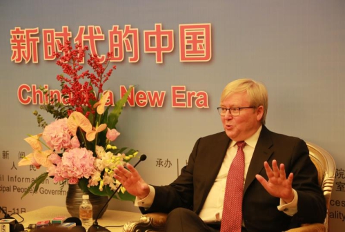 澳大利亚前总理陆克文在第七届世界中国学论坛期间接受记者采访。摄影:张晶