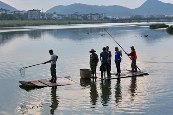 来到紧挨靖安县城旁边的北潦河,我们发现有在河水里洗菜的,也有在河岸上钓鱼的。河流中央一个小小的竹筏上,传来粗犷的歌声,虽听不大懂当地方言,但看得出竹排上的人正在做河流保洁的工作。