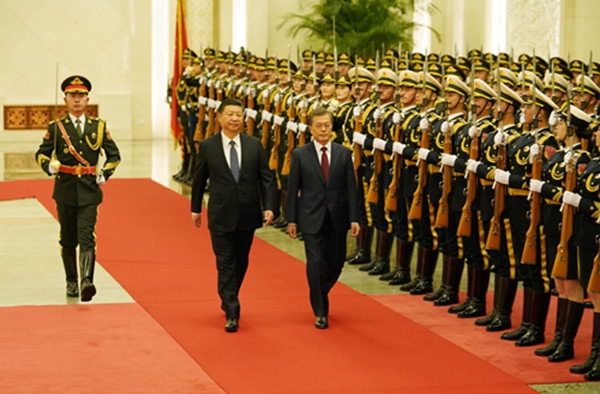 2017年12月14日,中国国家主席习近平在北京人民大会堂同来华进行国事访问的韩国总统文在寅举行会谈。会谈前,习近平在人民大会堂北大厅为文在寅举行欢迎仪式