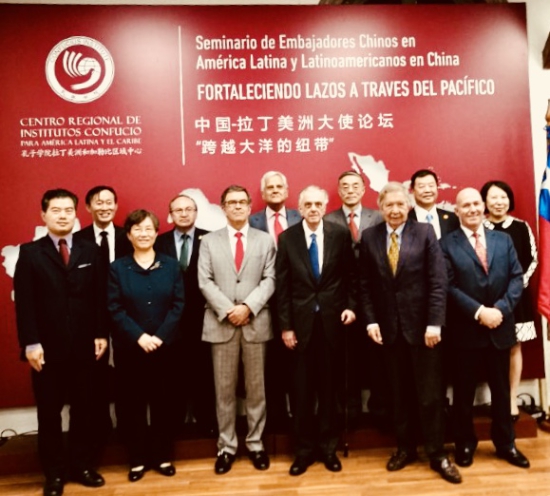 作为中国与拉丁美洲及加勒比国家共同体论坛第二届部长级会议重要活动之一,由孔子学院拉丁美洲中心主办,智利外交部亚太司、中国驻智利大使馆、北京语言大学、圣托马斯大学协办的“跨越大洋的纽带”——中国与拉丁美洲国家大使论坛于1月 20日在智利首都圣地亚哥举行。智利外交部亚太司副司长,中国驻智利大使馆代表,3位中国驻拉美前大使与4位拉美前驻华大使、圣托马斯大学总校长、北京语言大学代表以及智利政府官员、文化教育机构代表、华人华侨代表就中拉合作与未来发展相关主题进行了热烈讨论,北京语言大学校长助理在论坛做“建造友好之桥 共筑中拉命运共同体”重要发言。