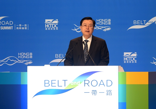 2016年5月18日上午,张德江出席“一带一路”高峰论坛并发表主旨演讲。他指出,香港是中国的特别行政区,也是“一带一路”建设的重要节点。中央政府在制定“十三五规划纲要”和设计“一带一路”愿景与行动时,均把支持香港参与和助力“一带一路”建设作为重要的政策取向。