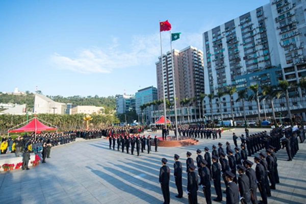 2017年12月20日,澳门特区政府在金莲花广场举行升国旗、区旗仪式,庆澳门回归祖国18周年,澳门特别行政区行政长官崔世安及政府主要官员、中央驻澳机构负责人、社会各界人士出席。图为升旗仪式现场