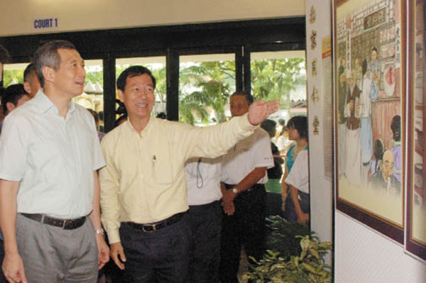新加坡总理李显龙(左一)访问社区,陈立发(右)向李总理介绍同仁堂的发展历史
