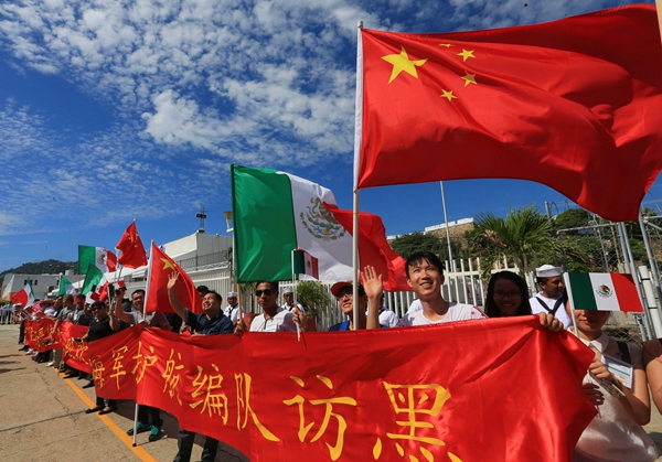 墨西哥华侨华人、留学生代表挥舞着中墨两国国旗,手持横幅热烈欢迎中国海军编队到访墨西哥