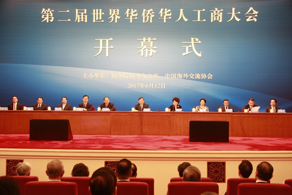 2017年6月12日至13日,第二届世界华侨华人工商大会在北京举行。图为国务委员杨洁篪、国务院侨办主任裘援平出席开幕式