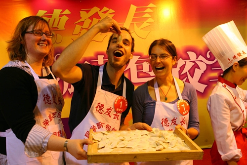 “老外”角逐包饺子比赛
