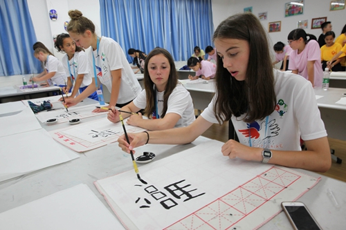2017年7月5日,法国青少年在四川省眉山市冠成七中实验学校学习中国书法