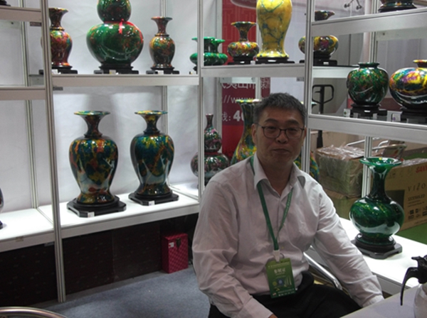 在鎏金瓷杯上,花朵在金色的茶杯上分外显眼。“我们的产品也叫‘浮雕法华彩’,牡丹的图案则寓意吉祥富贵。”台湾井玉龙公司的施季萱说,“与中国古代传统法华彩(一种陶瓷产品)不同的是,师傅用手工勾勒浮雕后再进行填彩,并熔入鎏金进行绘制,让釉面层次更加丰富。”