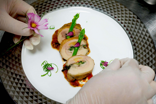 由于尼泊尔特殊的宗教和饮食习俗,在为此次来访贵宾准备定制菜单时,酒店大厨在食材选择、菜肴口感、菜品顺序及服务流程上反复推敲,精选时令本土食材、搭配荤素营养,结合傣泰料理特色,为贵宾献上一系列“山野风味邂逅高端定制”的傣泰风情午宴,其中“傣式酸野菜煮江鱼”及“傣式烤鸡腿香料卷及番茄喃咪”更是两款升级于传统傣式风味的经典菜肴。