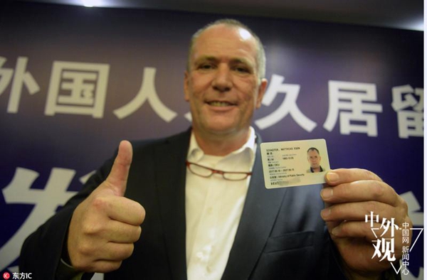 资料图:浙江首发新版“中国绿卡” 国际友人连比大拇指喜笑颜开(东方IC)