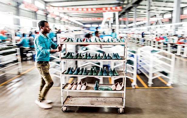 埃塞俄比亚首都亚的斯亚贝巴郊外的东方工业园,当地员工在华坚女鞋生产线上工作