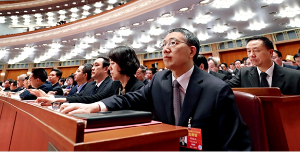 2019年 3月15日,十三届全国人民代表大会第二次会议在北京人民大会堂举行闭幕会。图为代表在表决