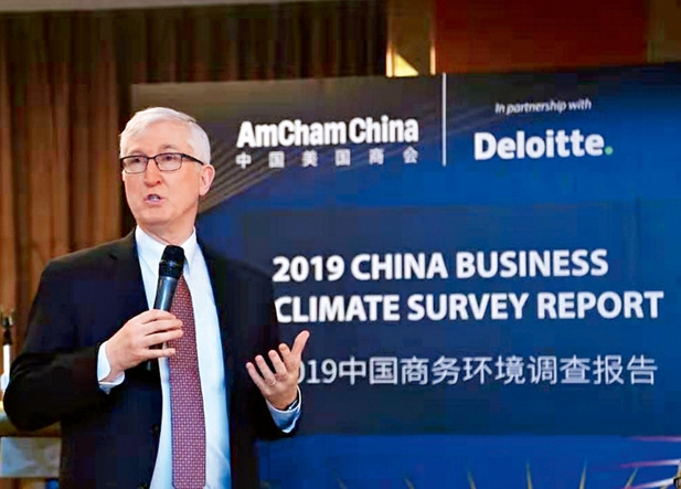 2019年2月26日,中国美国商会主席夏尊恩在北京发布了《2019中国商务环境调查报告》