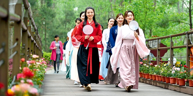 汉服爱好者身穿传统服饰在公园内赏花游玩